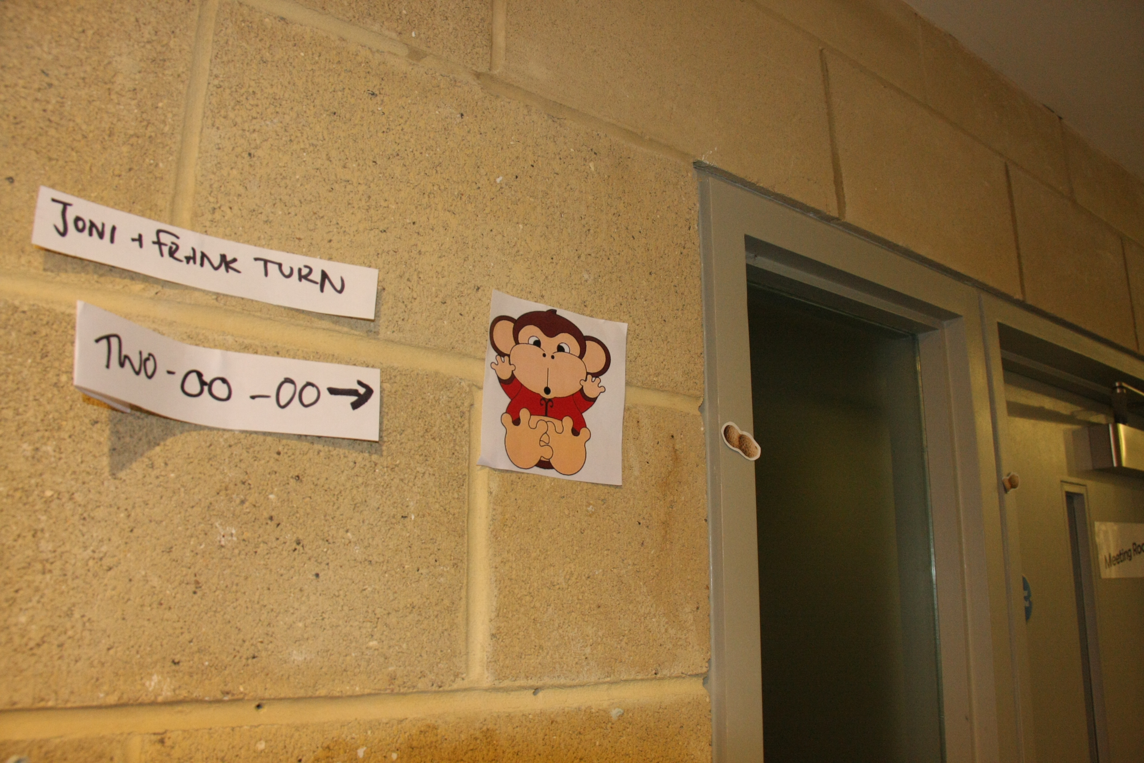 I decide that a sip of fake bubbles will help. But I am unable to keep track of my drink while continuing to attach pictures of monkeys and their nuts everywhere, so my hope for it calming me down doesn’t quite come to fruition. And now little girlie one is crying non-stop. Hoosboond tells me that the best use of my time is to comfort little girlie one rather than decorate an empty corridor with nuts. I don’t even laugh at the ludicrousness of this sentence. Instead I smoothly (ish. I mean, considering that I was pointlessly decorating an empty corridor with nuts) flip into calm, quiet mother mode and together me and little girlie one wander around happily looking at all my wonderful pictures of monkeys and nuts (ah-ha! there was a point to them after all). She has just calmed down and is quietly murmuring a tentative ‘oo-oo-oo’ when someone rushes out of the party room bearing the news that ‘there has been a disaster with your biscuits!’. I smoothly flip out of calm, quiet mother mode and rush into the kitchen, sending little girlie one into floods again. The biscuits have been left too close to the sink and the box is now full of water with a dozen now double-sized, handmade, hand-decorated, house-destroying monkey biscuits in it, all doing the back stroke.